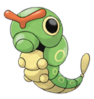 Caterpie has a voracious appetite. It can devour leaves bigger than its body right before your eyes. From its antenna, this Pokémon releases a terrifically strong odor. It is covered with a green skin. When it grows, it sheds the skin, covers itself with silk, and becomes a cocoon. Its short feet are tipped with suction pads that enable it to tirelessly climb slopes and walls. It tenaciously climbs trees and forages.