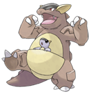 To avoid crushing the baby it carries in its pouch, it always sleeps standing up. The infant rarely ventures out of its mother's protective pouch until it is 3 years old. If it is safe, the young gets out of the belly pouch to play. The adult keeps a close eye on the youngster; if you come across a young Kangaskhan playing by itself, you must never disturb it or attempt to catch it. The baby pokémon's parent is sure to be in the area, and it will become violently enraged at you. To protect its young, it will never give up during battle, no matter how badly wounded it is. It is skilled at attacking using Comet Punch.