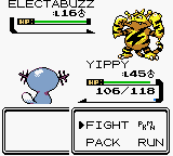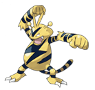 Electricity runs across the surface of its body. In darkness, its entire body glows a whitish-blue. Its body constantly discharges electricity, getting close to it will make your hair stand on end. When two Electabuzz touch, they control the electric currents to communicate their feelings. When a storm arrives, gangs of this pokémon compete with each other to scale heights that are likely to be stricken by lightning bolts. Some towns use Electabuzz in place of lightning rods.